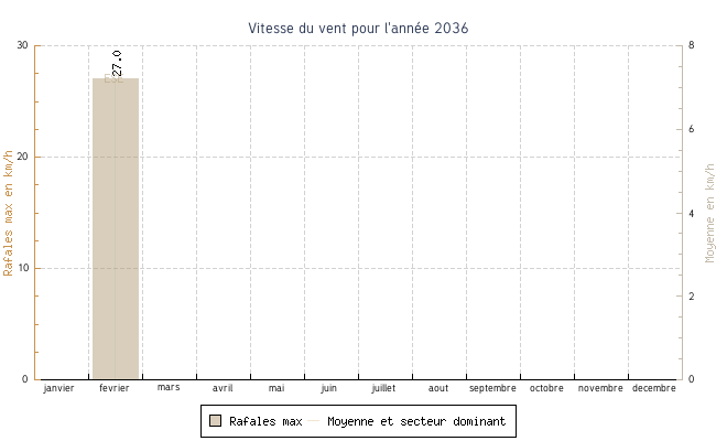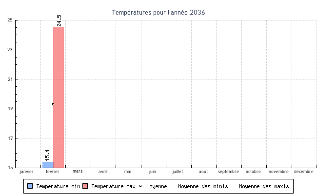| fevrier | 15.4 °C | 16.3 °C | 24.5 °C | 22.0 °C | 19.3 °C | 7.6 km/h | 27.0 km/h | ESE |